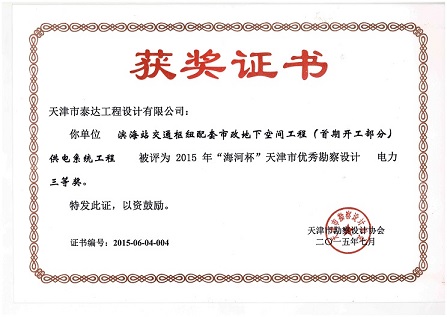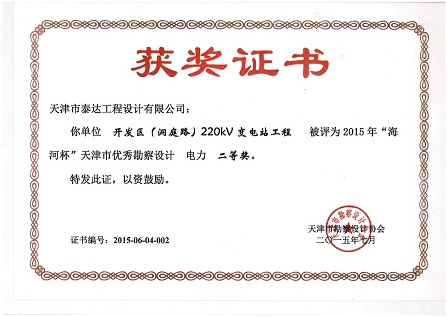 在電力設(shè)計分公司及相關(guān)部室的精心準(zhǔn)備和不懈努力下,由我公司設(shè)計完成的“開發(fā)區(qū)(洞庭路)220kV變電站工程”和“濱海站交通樞紐配套市政地下空間工程(首期開工部分)供電系統(tǒng)工程”,分別榮獲天津市勘察設(shè)計協(xié)會2015年“海河杯”優(yōu)秀勘察設(shè)計電力二等獎和三等獎;此外,公司重點(diǎn)項目“千米橋220kV變電站工程”榮獲國家電網(wǎng)公司2015年度輸變電工程優(yōu)秀設(shè)計二等獎。